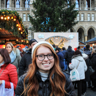 Wood huts lined the square and green garland trimmed the white roofs. I felt like I was walking through a gingerbread wonderland! I was one step behind of Oliver the whole time sporting a toothy grin and gigantic heart eyes. There were rows and rows of stalls overflowing with traditional Christmas cookies and goodies, hand-carved nativity scenes, and ornaments. There was a marching band playing Christmas carols by City Hall and twinkling lights hanging from every tree and hut in sight. A real-life winter wonderland.